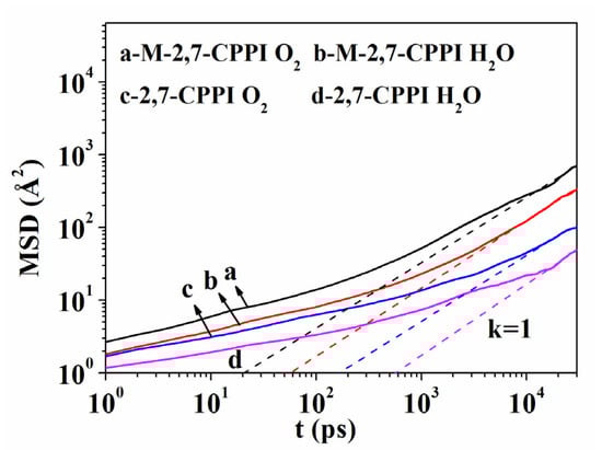 The MSD vs. time plots of H2O and O2 in the two polyimides are presented in Figure 11. According to Einstein’s equation, the diffusion coefficients (D) of O2 and H2O were determined from normal diffusion interval, in which the plot slope was unity. The D values are shown in Table 5. The meta-based M-2,7-CPPI displayed larger D values of H2O and O2 compared with those of 2,7-CPPI. Changing the linkage from para to meta disrupted chain packing and weakened intermolecular forces, thus leading to increased free volume. As a result, the diffusion coefficients of H2O and O2 were enhanced in M-2,7-CPPI. Additionally, it can be found that in a fixed PI matrix, the D of O2 was larger than that of H2O, even though the kinetic radius of O2 was bigger. This was mainly owing to the high interaction between the polar water molecule and the PI, impeding H2O diffusion [].