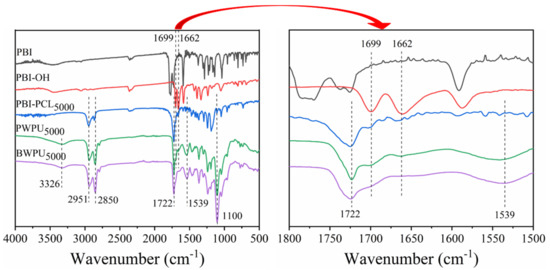 FTIR spectra of PBI, PBI-OH, PBI-PCL5000, PWPU5000 and BWPU5000.
