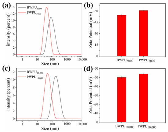 (a) Particle size and distribution of BWPU5000 and PWPU5000; (b) zeta potential of BWPU5000 and PWPU5000 emulsions; (c) Particle size and distribution of BWPU10,000 and PWPU10,000; (d) zeta potential of BWPU10,000 and PWPU10,000 emulsions.