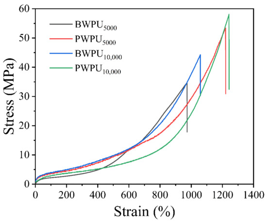 Stress-strain curves of BWPU5000, BWPU10,000, PWPU5000 and PWPU10,000 films.