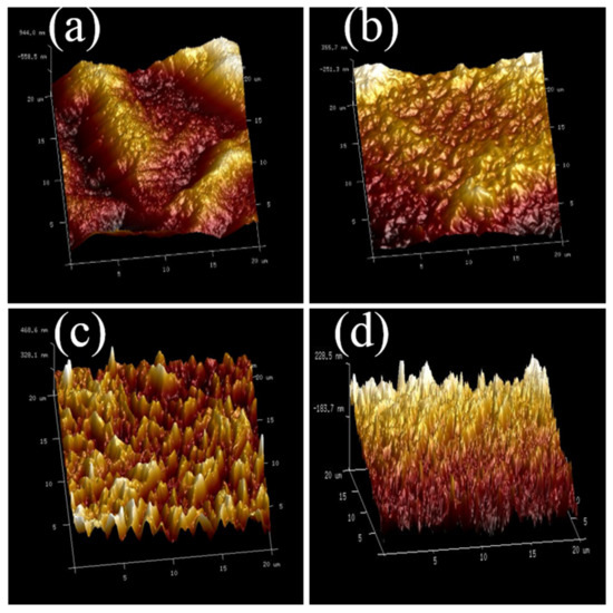 3D morphology images of BWPU5000 (a), BWPU10,000 (b), PWPU5000 (c) and PWPU10,000 (d).