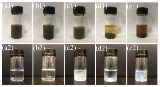 Photos of PWPU5000 with a mass of 0.5 g soaking in different solvents (4 mL) at 25 °C for 3 h. (a1) DMF, (b1) NMP, (c1) acetone/ethanol (v/v = 2:1), (d1) acetone, (e1) ethanol; Photos of BWPU5000 with a mass of 0.5 g soaking in different solvents (4 mL) at 25 °C for 3 h. (a2) DMF, (b2) NMP, (c2) acetone/ethanol (v/v = 2:1), (d2) acetone, (e2) ethanol.