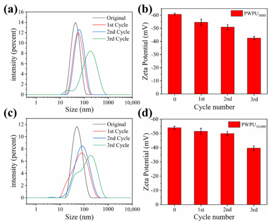 The storage stability of recycled PWPU emulsions was evaluated by DLS. The Z-average diameter (Dz) and the size distribution of recycled PWPU emulsions are shown in Figure 11. The Dz of PWPU5000 emulsion increased from 40.26 to 97.95 nm. The size of PWPU10,000 emulsion increased from 49.05 to 122.02 nm after the recycling process was repeated three times (Figure 11a,c). The key reasons are as follows: The particle size of waterborne polyurethane is primarily related to the hydrophilicity of the chain segment. After triethylamine neutralizes dimethylolpropionic acid, the chain segment contains the carboxylate group. Ionization of carboxy group makes the prepolymer have certain hydrophilicity and accomplishes the purpose of self-emulsification in dispersing. Triethylamine is highly volatile, which could volatilize following the evaporation of water. The degree of ionization for carboxy group is subsequently reduced. Thus, as recycling cycles increase, the hydrophilicity of the system gradually decreases, leading to increased particle size. The size distribution of recycled emulsion gradually increases, and the absolute value of zeta potential in the system decreases. In the meantime, the absolute values of zeta potential of PWPU5000 and PWPU10,000 recycled emulsions decreased from 60.7 to 42.6 mV and from 54.0 to 39.7 mV, respectively (Figure 11b,d and Figure S9). Although the Dz of recycled emulsions increase gradually, the absolute values of zeta potential of recycled emulsions were higher than 39 after being recycled three times. Moreover, zeta potential is the parameter which determines the stability of particles. Consequently, the PWPU emulsions still retain excellent stability after three recycling processes.