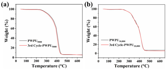 TGA curves of PWPU5000 (a) and PWPU10,000 (b) samples before and after three recycling processes.