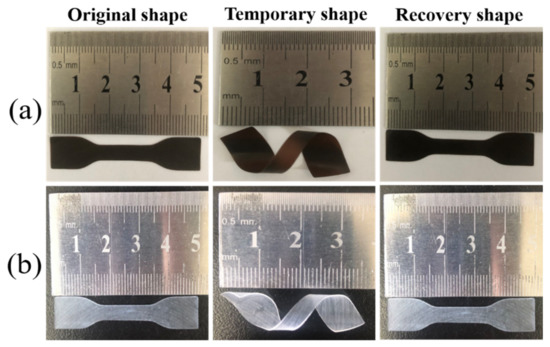The shape-memory behavior of PWPU5000 (a) and BWPU5000 (b). Photos with original shape, temporary shape (deformed at 25 °C for 20 min and fixed at 0 °C for 20 min) and recovered state after being soaked in 70 °C water.