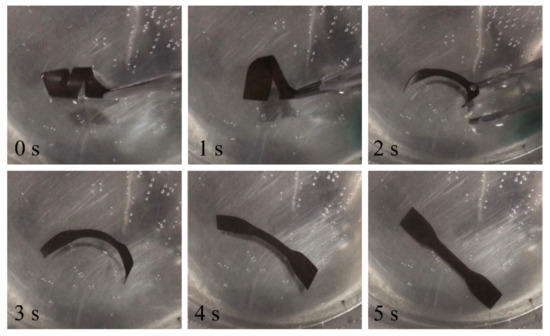 The soft and hard segments of waterborne polyurethane materials are thermodynamically incompatible and can easily form their separate microregions and undergo microphase separation [40]. It is the characteristic of the block structure of polyurethane materials that gives them their shape-memory function. During the shape-memory process, the physical crosslinking point provides the strength of the material. The soft segment acts as a shape-memory unit to fix the temporary shape [41]. AFM and DMA results indicate that BWPU and PWPU films exhibited a microphase separation structure. Therefore, they had potential shape-memory properties. First, the dumbbell-like film was made into a particular shape at 25 °C for 20 min under external force. Then, the film was placed in a 0 °C refrigerator for 20 min to get a temporary shape which recovered to its original state after being soaked in 70 °C water (Figure 14, Figure S11). Figure 15 shows that PWPU5000 recovered in 5 s in 70 °C water (Movie S1), and BWPU5000 took 8 s to recover in 70 °C water (Figure S12, Movie S2). After keeping the temporary shape for 20 min at 0 °C, heating the PWPU10,000 and BWPU10,000 to 70 °C, the temporary spiral shape recovered its original shape in 9 s (Movies S3 and S4). It can be observed that the introduction of PBI-PCL as a soft segment in waterborne polyurethane had a positive effect on the shape-memory function.