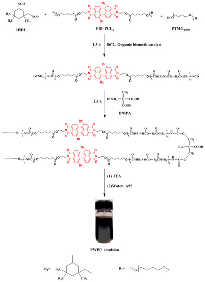 1,7-dibromo-3,4,9,10-perylene tetracarboxylic anhydride (PBI) was obtained from Zhengzhou Alpha Chemical Co. Ltd. (Zhengzhou, China). Polytetramethylene ether glycol (PTMG, Mn = 2000) was obtained from Beijing Branch, Du Pont China Holding Co. Ltd. (Beijing, China) and was degassed and dried under high vacuum (0.8 mmHg) at 120 °C overnight before use. Isophorone diisocyanate (IPDI), ethanolamine, 6-caprolactone, 1,4-butanediol (BDO), stannous octoate, 2,2-bis (hydroxymethyl) propionic acid (DMPA) and triethylamine (TEA) were all purchased from Shanghai Macleans Biochemical Technology Co. Ltd. (Shanghai, China). Organic bismuth catalyst and 2-[(2-aminoethyl) amino]-ethanesulfonic acid monosodium salt (A95) was procured from Sinopharm Chemical Reagent Co. Ltd. (Shanghai, China). The solvents ethanol, acetone and N-methyl-2-pyrrolidone (NMP) were of analytical grade, provided by Shanghai Aladdin Biochemical Technology Co. Ltd. (Shanghai, China). The solvent toluene was of analytical grade, provided by Sinopharm Chemical Reagent Co. Ltd. (Shanghai, China). Toluene was freshly distilled before use.
