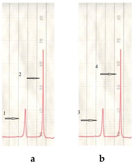 Figure 1. Typical chromatogram of adipic acid esters. (a) 1—dibutoxyethyl adipate, 2—decyl butoxyethyl adipate; (b) 3—diphenoxyethyl adipate, 4—decyl phenoxyethyl adipate.