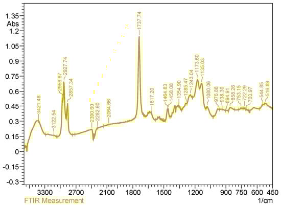 The preparation of esters of adipic acid was confirmed by IR spectra (Figure 2 and Figure 3). Thus, the spectra of the synthesized adipates lack an absorption band in the range of 1685–1687 cm−1, which is characteristic of stretching vibrations of the carbonyl group in associates of aliphatic carboxylic acids. Unlike carboxylic acids, in esters, the stretching vibrations of the carbonyl group are shifted to the high-frequency region and appear as a strong characteristic band in the 1750–1735 cm−1 range. The IR spectra of the obtained products exhibit absorption bands corresponding to the ester bands: in the region of 1737 cm−1 for DBEA and 1736 cm−1 for DPEA, which correspond to stretching vibrations of the carbonyl group in esters, and absorption bands at 1157 cm−1 for decyl butoxyethyl adipate and 1173 cm−1 for decyl phenoxyethyl adipate, which correspond to the vibrations of the C–O–C ester fragment.