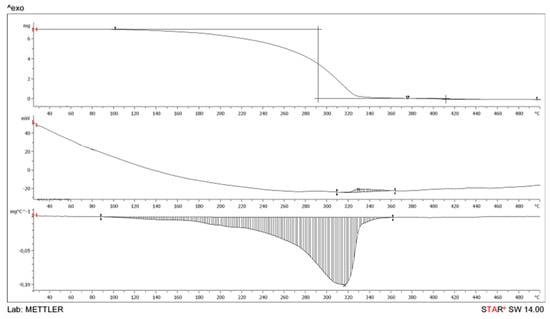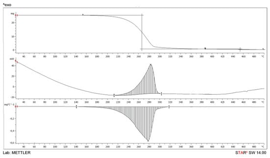 The measurements of the thermal stability of the sample were carried out in the temperature range from 25 to 500 °C in air. The measurements were carried out in a dynamic mode with a constant heating rate of 5 K/min. The mass of the sample used for measurements was 5–10 mg. For the analysis, we used alumina crucibles with a volume of 100 μL. The cooling rate of the device is 20 K/min. The measurement error is ±0.3 K. The results were processed using a computer and STARe thermal analysis software.