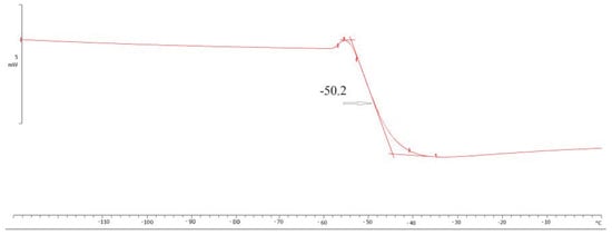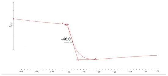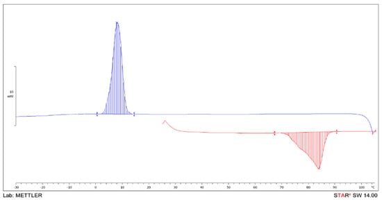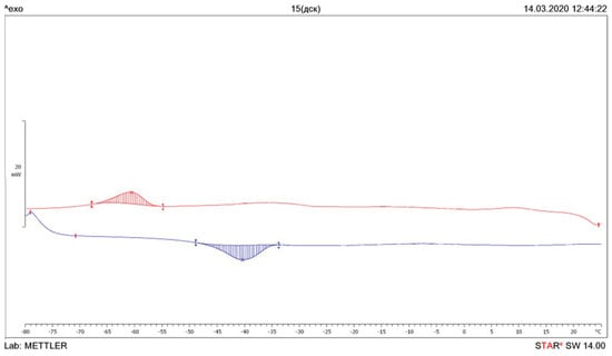 The crystallization temperature of the plasticizer was determined according to the DSC curve obtained in the cooling mode of the sample after its preheating by 30–40 °C higher than its melting point. The crystallization temperature of the plasticizer corresponds to the maximum value of the exothermic peak observed on the DSC curve.