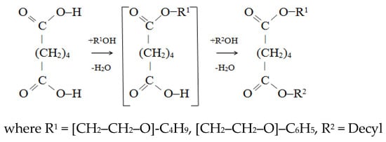 Unsymmetrical adipates were obtained according to the method described earlier [30]. Briefly, 150 mL of o-xylene, 1 mol of ethoxylated alcohol, 3.0 g (1% by weight) of p-toluenesulfonic acid, and 146 g (1 mol) of adipic acid were charged into the reaction flask, and the temperature was slowly raised to 90–100 °C. Stirring was continued for 1.5 h. The end of the reaction was determined by the acid number of the esterificate.