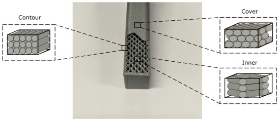 In this work, the mechanical behavior of FFF parts was represented by a three-zone model distinguishing among the following zones: cover, contour, and inner (Figure 1). Each zone corresponded to a different printing pattern: covers were printed with crossed filaments; contours were printed with aligned filaments; and inner zones could adopt several different patterns, the most common being the ±45° pattern. The distinction between covers (horizontal surfaces) and contours was made based on the surface angle with respect to the horizontal printing plane: covers had a slope below 30° and contours above that threshold. Two different types of inner zones existed: in-fill and lattice structures. The in-fill type refers to a standard pattern defined by both its geometry and air gap, while the lattice consists of a structure made of a periodically repeated unit cell.