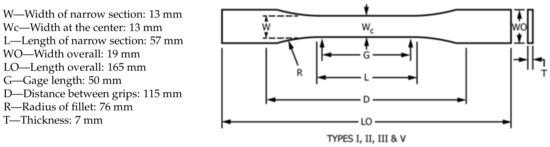 An initial strain rate of 0.1 mm/(mm·min) was selected, and a testing speed of 5 ± 1.25 mm/min was set for the tensile test according to Specimen Type I for rigid and semi-rigid samples [42]. The yield strength was identified by means of the offset method for determining yield strength considering an offset value of 0.1% [40].
