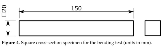 Following ASTM D790 [43], several square cross-section parts (Figure 4) were manufactured and tested under three-point bending conditions with a span between supports equal to 150 mm. The specimens were 150 mm long with a square cross-section of 20 × 20 mm2. All samples for the bending tests were printed with contours and covers with a thickness equal to 1 mm, and the in-fill structure was conformed by a ±45° linear pattern.
