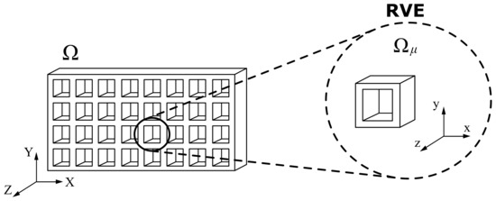 where stands for the macro displacements, for the micro displacements’ fluctuation, denotes the coordinates at the micro-scale, and at the macro-scale. Thus, the homogenization process was performed using a down-scaling process based on Equation (4), then solving the equilibrium equation of the RVE using the finite element method, and finally, up-scaling the results from micro to macro. Periodic Boundary Conditions (BCs) were applied at pairs of opposing faces of the RVE [45]: