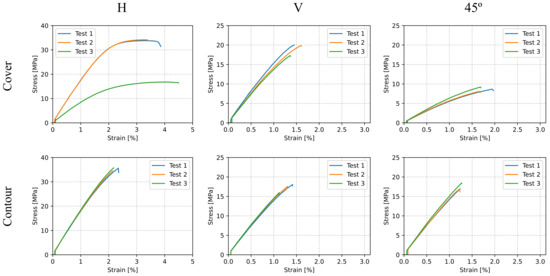 The stress–strain curves resulting from the tensile tests described in Section 3.1 are plotted in Figure 8. Charts in the first row correspond to the cover zone samples, while the second row shows those of the contour zone. The distinction among the printing orientation was made in the different columns. For convenience, the axes for both the vertical and 45° cases were scaled according to their data range. Table 3 shows the corresponding material parameters for the cover and contour zones.