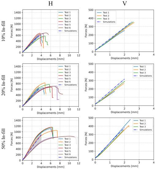 Figure 9 shows the force–displacement curves from the bending tests described in Section 3.2 along with their comparison with the simulation results within the elastic range. Right and left columns depict the horizontal and vertical cases, respectively, while each row represents a different in-fill percentage. For some configurations, the axes were scaled for convenience, similarly to the tensile test plots. Since a relatively wide dispersion was exhibited by these results, in particular the horizontally printed samples, a shaded area ranging from the minimum to the maximum obtained forces within the elastic range was plotted.