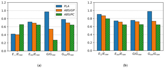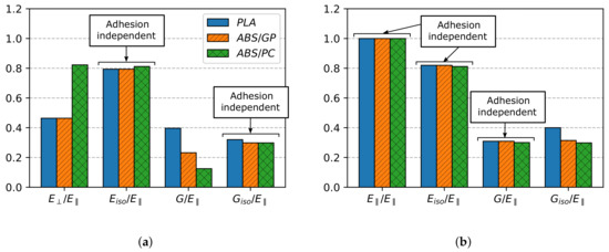 For comparison, the mechanical properties of PLA, ABS/GP, and ABS/PC were expressed as a ratio to their respective raw material properties. Figure 10 shows the non-dimensional comparison for the cover and contour zones. The properties of PLA and ABS/GP were taken from the previous works [32,33], where the experimental methodology of this paper was used. Their non-dimensional properties were within the expected range, all ratios being below unity. For this case, they can also be called normalized properties since all of them were of the same order of magnitude [34]. Two main material properties groups were distinguished: the ones unaffected by inter-layer adhesion (, , ) and the affected ones (, , , , ). This distinction was made a priori based on whether the inter-layer unions were stressed or not in their corresponding property test. For example, was adhesion independent since the fibers, and consequently the inter-layer joining, were aligned with the applied force in the corresponding test. In contrast, layer unions in formed 90° with respect to the applied force in the test, and therefore, adhesion effects may emerge.