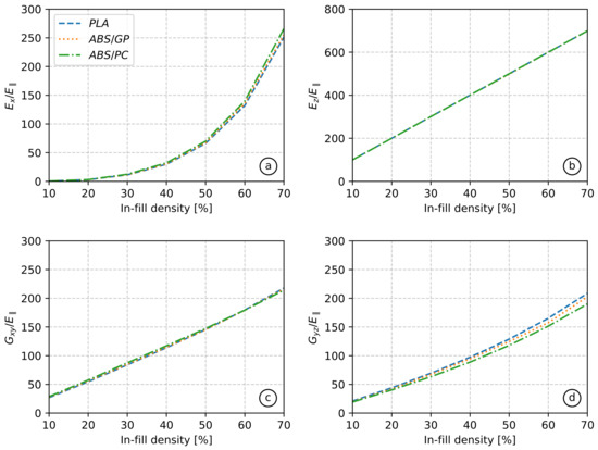The non-dimensional values for the ±45° in-fill referred to are depicted in Figure 12 as a function of in-fill density. Values corresponding to an in-fill density above 70% were not considered in order to avoid possible intra-layer phenomena. Poisson’s ratios were not plotted due to their lower influence on the material mechanical behavior. It can be seen that Young’s modulus in the Z direction showed a linear relationship with in-fill density, as expected, since stiffness in this direction and the area in the printing plane are directly proportional properties. In contrast, Young’s modulus in the isotropic plane showed a non-linear correlation with in-fill density due to the fact that the effective area of the RVE in X and Y directions had a more complex relation to in-fill density. Finally, it can be seen that the non-dimensional properties did not depend on the material. On account of that, computational homogenizations for the in-fill characterization can be replaced by charts as those in Figure 12, obtained experimentally or computationally.