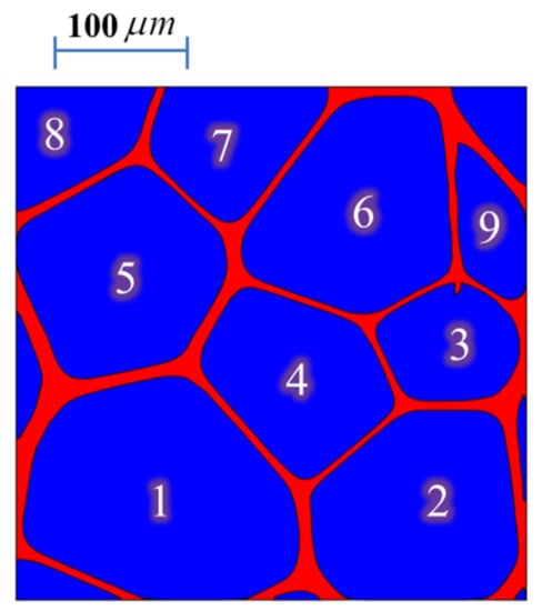 Flow visualization has shown that the resulting motion by natural convection of the fluid entrapped in closed cavities is truly two-dimensional [22]; hence, the image shown in Figure 1 is appropriated to incorporate realistic microstructural features of foamed materials in the computational domain and allows for the proper definition of conjugate natural convection with conducting walls. Additionally, in the work of Coquart et al. [6], 3-D images were used to study numerically the conductive behavior of this polymer foam. Hence, the REV constructed using the slice of the tomographic 3-D image fulfills the representative features of the material to study the macroscopic response, i.e., the effective thermal conductivity [6]. The binary image after processing (raster image)—a slice of the tomographic 3-D image—was converted to a vector image (v.dx file) to set the computational domain for the FEA, as was done in [23]. To find the average cell size which suppresses gas convection, the REV size was scaled by 40×, 50×, and 60× in a parametric study to produce a Rayleigh number of 103 in at least one of the cells. In Figure 1, pores are numbered for the individual cell characterization, as listed in Table 1.