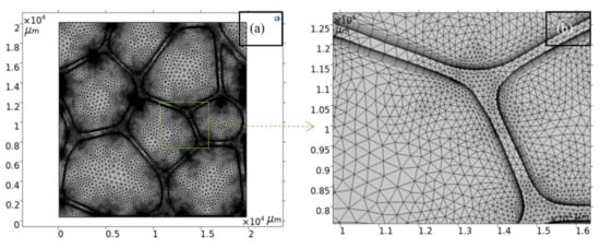 The governing equations are solved using the Galerkin finite element method (FEM). A fully coupled solution for the primitive variables (, , ) is used, where, the interpolation functions to represent the velocity and pressure are of the type P2-P1. To suppress the non-physical spatial oscillation that may occur in the numerical solution in the convection terms, the Streamline/Upwind Petrov Galerkin method is included to stabilize the Navier–Stokes equations. The temporal terms are discretized in an implicit fashion by using a second-order backward difference formula (BDF) scheme of the first and second order. The time steps are controlled by the numerical solver: adaptive time-stepping. The numerical accuracy was checked with a convergence study, where further mesh refinement and the decrease in the values of the relative tolerance (to lower the adaptive time step size in the solver) do not produce visible changes in the results so as to ensure mesh-independent solutions, as was done in previous CFD studies [25]. Figure 2a shows an example of a structure of the meshes used in the computations. The finest mesh size is provided adjacent to the pore wall to properly resolve the boundary layers, as shown in Figure 2b. Nine boundary layers were included. During the mesh refinement study, up to 15 boundary layers were considered. Variations in the rapid changes experienced by variables such as temperature, velocity and pressure in the wall normal directions were not observed during mesh refinement. Hence, it was considered that rapid changes in key variables are captured, appropriately including nine layers, because the increase in the number of boundary layers does not yield different solutions. No skewed elements were obtained in the boundary layer; however, in the roof boundary layer transition from quadrilateral to triangular elements, there are some regions where the mesh became anisotropic with some skewed elements. These skewed elements do not significantly affect the field of key variables, allowing a good transition from the quadrilateral elements to the triangular ones. For the as-processed microstructure, the number of elements is 94,350, whereas, for the largest scaling (60×) of the studied microstructure, the number of elements is 137,713. Convergence within each time step was tracked in the solver log where no failures were reported. The non-linear problem is solved by the damped Newton method with a constant value equal to 0.9 for the damping factor. The linearized subproblems that arise at each Newton iteration are solved by the direct solver PARDISO with the Nested dissection multi-threaded row pre-ordering. The studies were computed up to the time of 15 s, because, at this time, it was observed that the heat transfer process reaches a steady state in all cases.