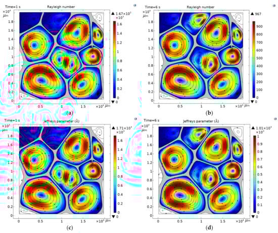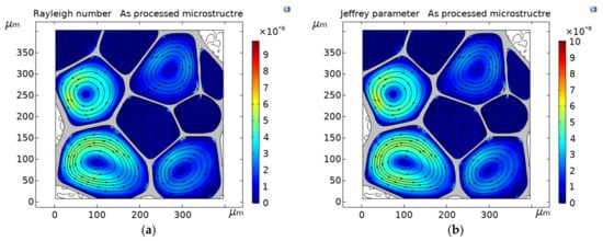 (a) Rayleigh number, and (b) Jeffreys parameter for the as procced PVC microstructure at time of 5 s. Streamlines represent vector velocity plotted at uniform density of 0.02. PVC (solid phase) is shown in gray color.