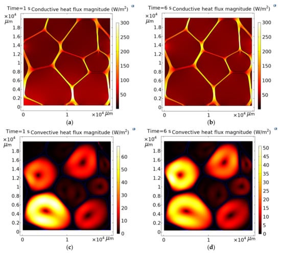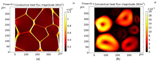 Figure 8 shows the conductive and convective heat flux magnitudes during unsteady and steady-state heat transfer for the scaling 2. A comparison between the heat flux shown in Figure 4a, where convection is virtually eliminated by conduction, and Figure 8 a,b, shows that the conduction paths are not altered by the creation of convection flux in unsteady or steady-state heat transfer. In addition, the air circulations (streamlines) within the cavities keep the same directions in all cases, indicating that the heat is gained in the air from the same point of the wall. Figure 7c,d also shows that variations in the size and shape of the cavities produce different behavior of the convective currents, but in the central core of the currents, convection is suppressed because, in the core, the fluid is stagnant. For pores that exhibit notable changes in the aspect ratio, for example, the square and ellipsoidal shapes, such as the pore numbers 4 and 7, (see Figure 1 for the numbering of pores) two circulation currents are formed. These results support the fact that convective transport is anisotropic in foams, as documented in [11]. From the results shown in Section 3.3, Section 3.4 and Section 3.5, it can be generalized that the amount of heat transported by convection is about 20% of the heat transported by conduction within the foam for the onset of convective heat transfer, which produces an increasing average of the of about 4.5% with respect to a constant value. A study suggests that radiation may contribute 6–26% of the effective conductivity [5]. According to these results, conduction is the most dominant energy transfer mechanism in cellular materials, followed by radiation and convection.