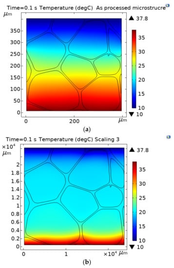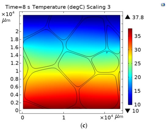 Figure 5 shows the temperature distribution across the as-processed microstructure (Figure 5a), and the scaling 3 (60×), which is the higher scaling studied case (Figure 5b,c). These temperature distributions were obtained for a given differential temperature of 27.8 °C. In all cases, including scaling 1 (40×) and 2 (50×) (temperature distribution not shown), the temperature distributions across the material are similar at the steady-state. However, the time taken for the heat transfer process to reach steady-state was different in each case: for the processed microstructure, the time was 0.1 s, whereas, for scaling 1, scaling 2, and scaling 3, the times to reach a steady-state were, 3, 6, and 9 s, respectively. This is because, as the pore size is increased, the heat transfer distance is elongated, which, in turn, delays the heat flux, and modifies the temperature distribution across the material for a given time, before the steady heat transfer is stablished, as shown in Figure 5b,c. The increase in the heat transfer distance causes sharp temperature gradients across individual pores nearest to the hottest temperature, which progressively shift to neighboring cavities in the flow direction until to a steady-state is reached (Figure 5b). Sharp temperature gradients across the cavities, in combination with the pore sizes, which allow for the motion of fluid because of gas density variations, develop the convection currents. As the convective heat transfer is activated via temperature differences across individual cells; if the pore size allows the motion of air occluded, the thermal conductivity is temperature-dependent. These results are in agreement with reference [28], where increased heat flux depending on the variations in thermal conductivity for porous materials with low density were attributed to the creation of more convection and radiative heat mechanisms. On the other hand, it was observed that the convective heat transfer does not alter the temperature distribution across the material once the heat transfer reaches a steady-state, independently of the cavity sizes (Figure 5a,c). Therefore, the temperature distribution across the material in steady-state heat transfer is imposed by conduction, as this is the most dominant heat transfer mechanism.