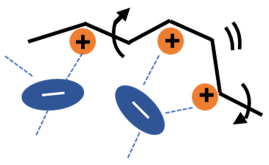 For PILs having large-size counterions, as shown in Figure 1, the Coulomb interaction is relatively weak due to the charge delocalization in these anions since CF3 and CF2 are strong electron-withdrawing groups. As a result, the degree of dissociation becomes high, and the dissociated anion can behave as solvent (diluent) molecules to reduce the interchain coupling. Such dilution effects can be further supported by the fact that the glass transition temperature is much lower for PILs with TFSI and CPFSI than those with smaller counter-anions, such as BF4 [22]. The dilution of PIL chains by the dissociated anion can lead to the appearance of the intramolecular mode (sub-Rouse mode). NfO has a molecular size comparable to TFSI but has a structure with negative charges concentrated on only one side. From this feature, the anionic side of a NfO molecule bind to the polymer cation with higher strength than TFSI and CPFSI, and thus the solvent-like behavior (dilution effect) may not be readily apparent. Nevertheless, sub-Rouse relaxation was observed in the NfO system [24]. The stress-optical coefficient obtained by the rheo-optical measurements for this system indicated that the sub-Rouse mode is caused by the local motion of the polymer chain accompanied by the motion of the NfO anion. This result, therefore, suggests that the restriction of the segmental movement by the strongly bonded NfO makes the polymer chain stiffer and enhances the torsional sub-Rouse motion. We also assume that the interchain bonding via the NfO anion is unlikely to occur because the negatively charged coordination site, SO3−, is screened by the outer fluorocarbon segment, reducing the interchain cooperativity. In summary, in PILs with NfO anions, the effects of anion coordination and the shielding of intermolecular interactions make the sub-Rouse mode more pronounced. Recently, Zhang et al. performed MD simulations on a PIL/Li salt system and indicated that even the charge-delocalized TFSI anions could coordinate with polymer cations as schematically shown in Figure 2 [19]. From their simulation result, we assume that the intramolecular coordination structures depicted in Figure 2 can increase intramolecular cooperativity and possibly emphasize the sub-Rouse mode. Based on the above argument, we anticipate that polymer chain dynamics will be affected by changing the association structure of the counter ions to the polymer chain.