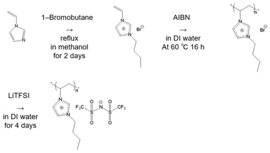 The synthesis of poly(1-butyl-3-vinylimidazolium bis(trifluoromethanesulfonyl)imide (PC4-TFSI) was carried out in the same method as reported previously [21,22,23,25] (see Figure 3). 1-Vinylimidazolium bromide (C4-Br) was first synthesized by quaternizing 1-vinylimidazole with the excess amount of 1-bromobutane in methanol for 2 days at 50 °C. After removing methanol and unreacted 1-bromobutane, the C4-Br was polymerized through free radical polymerization in DI water by using initiator AIBN for 16 h at 60 °C. Finally, PC4-TFSI was synthesized by converting counter anions from Br− to TFSI by titrating LiTFSI aqueous solution into PC4-Br aqueous solution and mixed for 4 days at room temperature.