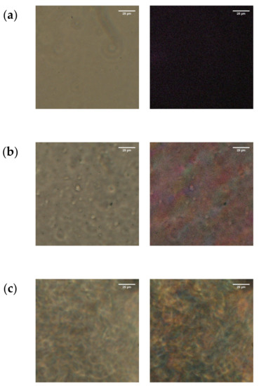 Optical micrographs for the PC4-TFSI/LiTFSI mixtures with = 0.3 (a), 0.4 (b), 0.5 (c). The left- and right-hand pictures are respectively the bright-field micrographs and the cross-polarized micrographs, in which the polarizer and the analyzer were set in horizontal and vertical directions, respectively. The scale bar in each figure is 25 μm.