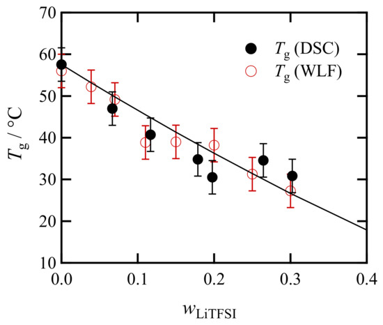 Dependence on the LiTFSI concentration for the glass transition temperatures measured by DSC (Tg(DSC)) and estimated from the viscoelastic shift factors (Tg(WLF)) explained in the Appendix A section. The solid curve represents the fit functions given by Equation (2).