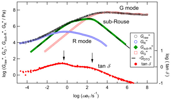 Reduced frequency ωaT dependence of G″ (Graw″) and tan δ for molten PC4-TFSI at the reference temperature, 80 °C. Three-component G″ functions (GR″, Gsub-R″, GG″) determined by modified-stress-optical-rule are overlayed on the raw data. The black dashed line represents the DTO model calculation used in the previous study [25].
