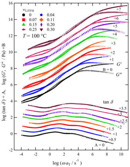 Angular frequency dependence of G′ (unfilled markers), G″ (filled markers), and tanδ for PC4-TFSI/LiTFSI mixtures with various LiTFSI concentrations at T = 100 °C. Each spectrum is vertically shifted with the factors B and A as indicated in the figure to avoid data overlapping.
