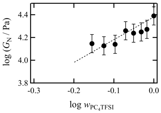 At the frequency of = 10−4–10−1 s−1, G′ exhibits the rubbery plateau region, indicating that the PC4-TFSI/LiTFSI mixtures in all the concentrations examined here are in a well-entangled state. The molecular weight of PC4-TFSI is 3.0 × 105, and the entanglement molecular weight Me is reported to be 2.2 × 104 [22]. Thus, considering M/Me = 14, it is reasonable to observe a plateau region with a frequency range of about three orders of magnitude. From the G′ spectra, we determined the plateau modulus GN as the value of G′ at the frequency where tanδshows a minimum in the rubbery plateau region at low ω [36]. Figure 8 displays the estimated values of GN as a function of the weight fraction of PC4-TFSI, (=). In this double logarithmic plot, the dotted line indicates a linear relation with a slope of 2. For flexible entangled polymer solutions (polymer component dissolved in a low molecular weight solvent), the plateau modulus is known to be proportional to the 2–2.3 power of the polymer volume fraction ϕ [37,38]. Assuming that the volume fraction and the weight fraction are the same because the densities of PC4-TFSI and LiTFSI are similar, the GN data being located on the dotted line implies that the addition of LiTFSI reduces the entanglement density of polymers due to the dilution effect in the similar manner as solvent molecules in ordinal polymer solutions. Thus our results demonstrate that LiTFSI can be regarded as merely a plasticizer for PC4-TFSI in the rubbery plateau region, and PC4-TFSI/LiTFSI mixtures behave like a flexible polymer solution system.