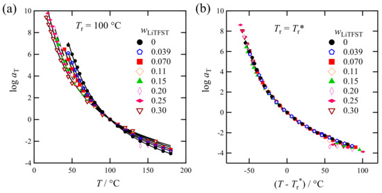 Figure 9a plots the obtained value of for PC4-TFSI/LiTFSI mixtures at the reference temperature Tr = 100 °C as a function of the measurement temperature. The shift factor decreased with increasing temperatures, regardless of . We fitted the curve of the neat PC4-TFSI () by the following Williams Landel Ferry (WLF) equation [39].