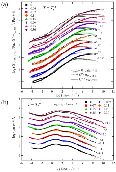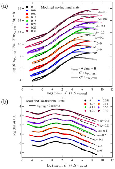 Comparison of (a) and (b) tan δ in the modified iso-frictional state for PC4-TFSI/LiTFSI mixtures with various LiTFSI concentrations. The A and B values are the same as those shown in Figure 10. Horizontal shift factors (Δ) depending on are shown in the figure.