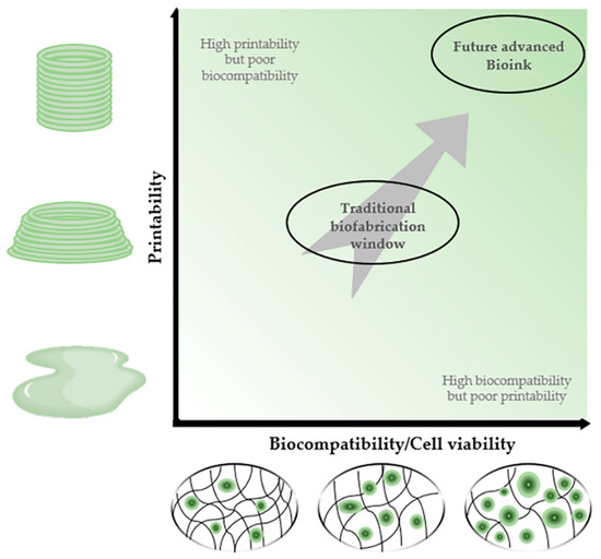 As mentioned above, bioink has been developed to address the challenges in both biocompatibility and printability together [18,19]. However, addressing one factor usually goes against the other such that low viscosity of bioinks could provide superior biocompatibility with high availability of cell adhesive surface area (namely high porosity), while its printability would not be sufficient to uphold the mechanical stability of the printed structure [20,21,22]. In other cases, the concentration of polymers has been elevated along with various solvents used for hydrogel synthesis to increase the printability and reinforce the mechanical strength of printed structure [23,24], which improperly influenced the biocompatibility [25]. Therefore, it is crucial for the newly developed bioinks to meet the fundamental requirements of both printability and biocompatibility [26,27] (Figure 1).