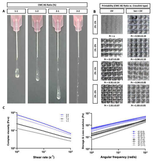 Figure 2. Printability optimization and rheological characteristics of different bioink formulations (CMC:XG concentration ratio set to 1:1, 1:2, 2:1, and 2:2). (A) Formation of fibers and droplets of bioink extruded from the nozzle. (B) Grid pattern of printed structure with calculated Pr value through the square shape in the grid pattern. Printability (Pr) value was calculated according to the equation defined by Ouyang et al. (2016) (n = 8) [23]. (C) Plot of complex viscosity by shear rate (left) and Storage (G′)/Loss (G′′) modulus by angular frequency.