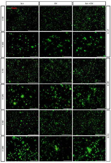 To analyze the encapsulated cell behavior within the cross-linked bioink, encapsulated hMSCs were cultured for 3 days. First, Live/Dead assay was performed at 24, 48, and 72 h to visually confirm the viability of cells in the case of bioink prepolymer cross-linked under three conditions (ion, UV, and ion + UV) (Figure 4). According to the acquired LIVE/DEAD images, under ion cross-linked conditions, many cell aggregates were present. As unmodified alginate lacks cell adhesivity and therefore could not specifically interact with mammalian cells [33], the cells were aggregated in ion cross-linking conditions. In the conditions cross-linked by UV, fewer number of aggregates were present with a greater number of cells with stretched orientation. Cells encapsulated in dual cross-linked bioink (ion + UV) promoted infiltration and thus induced stretched morphology. These results can be related to difference in pore size and distribution that has been adjusted by cross-linking mechanism, which may affect cell infiltration behavior and proliferation [58]. Therefore, subsequent analysis such as proliferation, F-actin cytoskeleton, and MMP expression analysis were carried out.