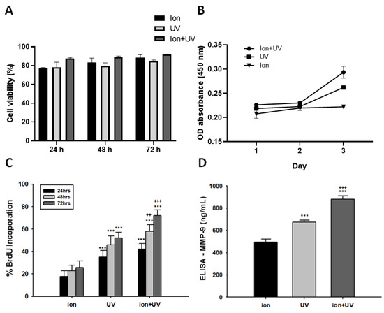 Figure 5. Cell viability analysis. (A) Cell viability assay of 3D-encapsulated hMSCs in hydrogel (n = 3). Cells under ion + UV condition shows better viability than other conditions. (B) CCK-8 cell proliferation assay (n = 3). The OD absorbance was measured at 450 nm. (C) Under ion + UV condition, compared other conditions, the BrdU incorporation were significantly higher values (n = 3). Data were expressed as mean ± S.D. *** indicates p < 0.001 vs. ion, ++ p < 0.01, and +++ p < 0.001 vs. UV). (D) ELISA assay of MMP-9. The expression level of MMP-9 was highest under ion + UV condition, followed by UV condition, and lowest under ion condition (n = 3) (data were expressed as mean ± S.D. *** indicates p < 0.001 vs. ion, +++ p < 0.001 vs. UV).