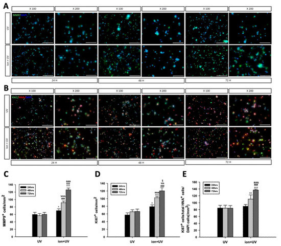 Figure 7. Immunocytochemistry staining assay. (A) Fluorescence images showing MMP-9/DAPI staining assay. (B) Fluorescence micrograph of Ki-67/HNA/DAPI staining assay (scale bar = 100×; 200 μm; 200×, 100 μm). (C) MMP-9-positive cells/mm2 (data were expressed as mean ± S.D. * indicates p < 0.05 vs. 24 h UV, ### p < 0.001 vs. 48 h UV, +++ p < 0.001 vs. 72 h UV, %%% p < 0.001 and $$$ p < 0.01 vs. 24 h ion + UV, &&& p < 0.001 vs. 48 h ion + UV). (D) Ki-67-positive cells/total HNA-positive cells/DAPI cells (data were expressed as mean ± S.D. * indicates p < 0.05 vs. 24 h UV, +++ p < 0.001 vs. 48 h UV, ### p < 0.001 vs. 72 h UV, &&& p < 0.001 and %% p < 0.01 vs. 24 h ion + UV, $ p < 0.05 vs. 48 h ion + UV). (E) Ki-67-positive cells/mm2 (data were expressed as mean ± S.D. ** indicates p < 0.01 vs. 48 h UV, +++ p < 0.001 vs. 72 h UV, ### p < 0.001 vs. 24 h ion + UV, &&& p < 0.001 vs. 48 h ion + UV). All experiments were conducted at least 3 times.