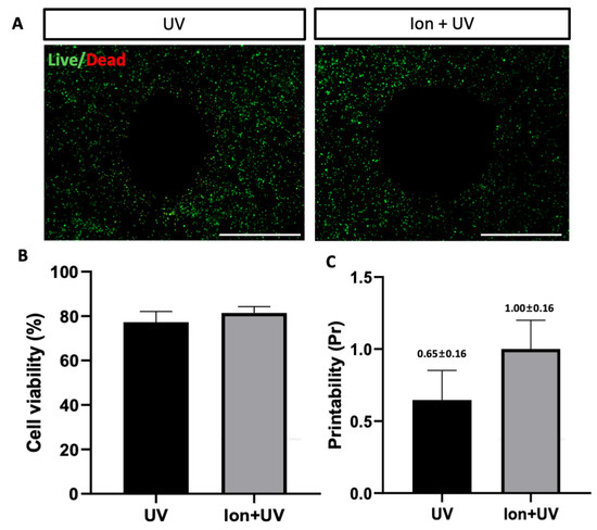 Figure 8. Cell viability of 3D-bioprinted hMSCs. (A) Fluorescence micrograph of Live/Dead assay for printed fiber. Bioink composition was 10:2:2:2 (GelMA:alginate:CMC:XG) and cross-linking conditions were UV and ion + UV. (B) Cell viability results of 3D-encapsulated cell in printed fiber (UV vs. ion + UV). (C) Printability (Pr) of printed fiber after 24 h (scale bar = 100×, 200 μm).