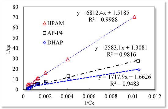 The key experimental parameters of the isotherm adsorption model were constructed based on the static adsorption experimental data. Different mathematical models were fitted based on the experimental data, and part of the adsorption mechanism was analyzed. The static adsorption experiment was conducted by the soaking method, using a UV spectrophotometer to determine the absorbance []. The specific steps were as follows: To prepare polymer solutions of different concentrations, 100 mL of polymer was placed in a wide-mouth bottle. Acid-washed quartz sand was added at a solid to liquid ratio of 1:9 with stirring, while the maximum contact time was 24 h. The supernatant was taken, and the concentration of the solution was diluted to 0.02–0.1 mg/mL. Then, each solution was mixed for 2 h, centrifuged on the first gear for 5 min, and kept to detect absorbance. The absorbance of each polymer solution was measured using a UV spectrophotometer, and the adsorption capacity was calculated using the standard curve data. The standard absorbance curves of HPAM, AP-P4, and DHAP are expressed by Equations (1)–(3).