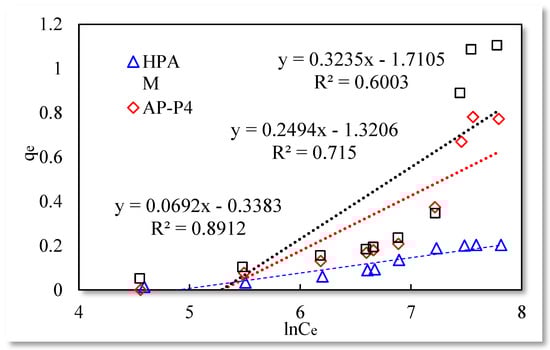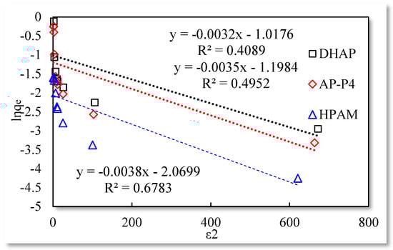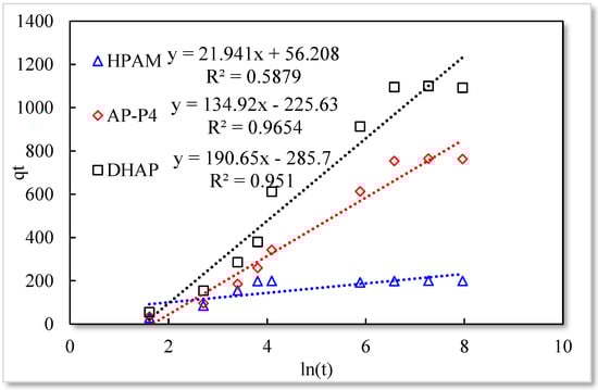The fitting results of the Langmuir isotherm adsorption model for the polymer solutions are presented in Figure 4. The Langmuir fit is extremely good for the three polymer solutions; however, the fitting degrees of AP-P4 and DHAP are lower than that of HPAM. The results of the Temkin isotherm adsorption model (Figure 5) confirm that only HPAM has a high fitting degree (89.12%). Based on the fitting formula and results, the adsorption of HPAM is consistent with the results obtained by various scholars. Polymer HPAM is adsorbed uniformly on the quartz sand surface, which is chemisorbed with strong intermolecular forces. There is no interaction between the adsorbate molecules, comparable to single molecular layer adsorption characteristics, with the maximum equilibrium adsorption capacity. The free polymer molecules are considered entangled with the adsorbed polymer molecules via hydrophobic association, raising the adsorption capacity. In contrast, the fitting accuracy of the mathematical model is reduced, particularly for the Temkin model.