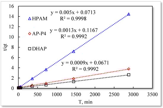 The adsorption experiment outcomes of polymers HPAM, DHAP, and quartz sand under various contact times are summarized in Table 4. As the polymer solution and quartz sand contact period increases, the polymer solution adsorption capacity gradually increases and tends to stabilize after a specific time [,,]. The equilibrium times of HPAM, AP-P4, and DHAP adsorption are 45 min, 6 h, and 6 h, respectively.