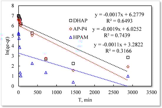 In the quasi-second-order kinetics, the adsorption rate index of HPAM is the highest, and its single chemical adsorption mechanism helps it reach adsorption equilibrium as soon as possible. The multimolecular layer entangled by association reduces the adsorption rate. The interaction force changes the relationship between free and adsorbed molecules. The DHAP dendrimer interaction is strong, so its adsorption rate index is the lowest. The fitting of the kinetic model establishes the adsorption mechanism and demonstrates the inferior ability of hydrophobically associating polymers and dendrimers to achieve stable adsorption. However, the adsorption capacity is large. The quasi-second-order kinetic and Elovich model high-precision fitting results further illustrate the importance of considering effective solution concentration, effective contact area, and flow movement on the adsorption capacity.