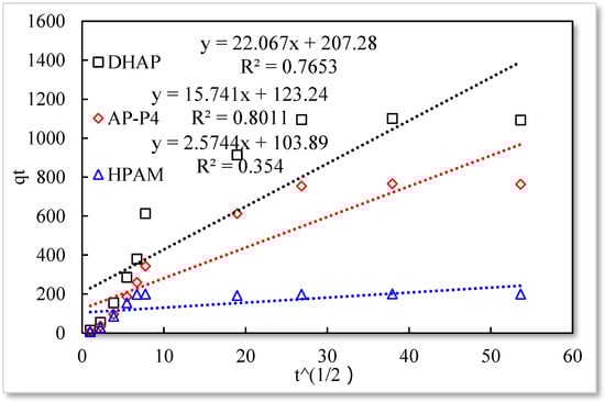 The fitting results of the four kinetic models were compared. The pseudo-second-order kinetic model fitting of the polymer solutions is very high, indicating that chemisorption is the primary polymer adsorption mechanism on the quartz sand surface. In the fitting of the Elovich model, DHAP and AP-P4 have high fitting degrees; specifically, the adsorption rate of DHAP, which decreases exponentially with increasing adsorption capacity. This finding explains the multimolecular layer adsorption and the extended time required to achieve adsorption equilibrium. The polymer solution contact adsorption with quartz sand mainly occurs by electrostatic and hydrogen bond chemisorption, forming a relatively stable monolayer adsorption layer. Subsequently, the entanglement between the free and adsorbed polymer molecules leads to the above-mentioned multimolecular layer formation. The winding process formed by the association is also a winding/unwinding dynamic equilibrium process. Thus, the adsorption equilibrium time of the polymer is significantly prolonged. The fitting degree of HPAM is low, implying the adsorption rate does not decrease exponentially with increasing adsorption amount. Chemisorption is the only adsorption observed, and only single molecular layer equilibrium adsorption occurs.