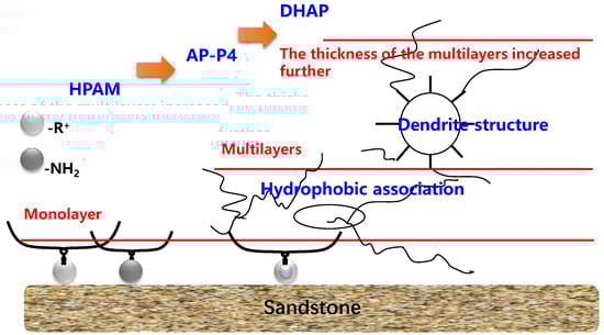 The adsorption capacities of HPAM and DHAP are 1.17–1.62 and 6.44–8.45 μg/cm2, respectively. HPAM is characterized by monolayer adsorption (see the adsorption diagram in Figure 13), and the unit surface area adsorption of polymer AP-P4 is 4.26–6.67 μg/cm2. The adsorption of DHAP per unit area is almost six times that of HPAM, which indicates that its adsorption thickness is six times that of HPAM. This can be attributed to the dendrite structure providing the molecules with a more extensive spatial distribution, increasing the molecular layer thickness, and leading to more noticeable multimolecular layer adsorption.